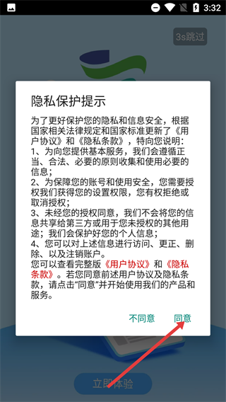 1、当出现【隐私保护提示】弹窗时,请先仔细阅读《用户协议》与《隐私条款》的相关说明,之后点击【同意】按钮,即可继续使用本产品的服务。