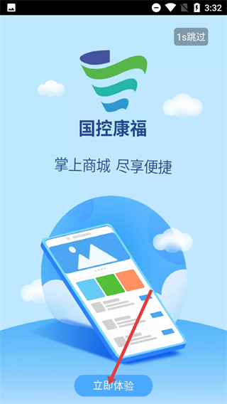 2、在【国控康福】的启动页面,等广告倒计时结束后,点击【立即体验】按钮就能进入应用的功能界面。