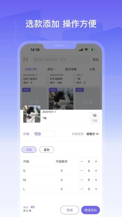 选款入库支持扫码枪批量导入,可自动识别服装品牌与款式编码,并匹配预设的规格参数完成建档工作。