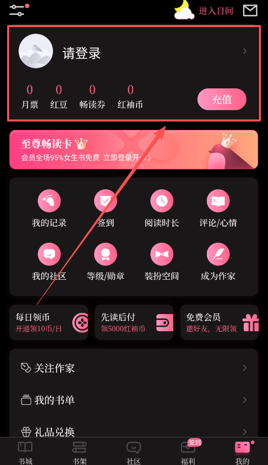打开软件后的首要操作是点击“我的”完成登录,如此一来便可解锁签到、阅读时长记录等功能,逐步达成阅读自由。