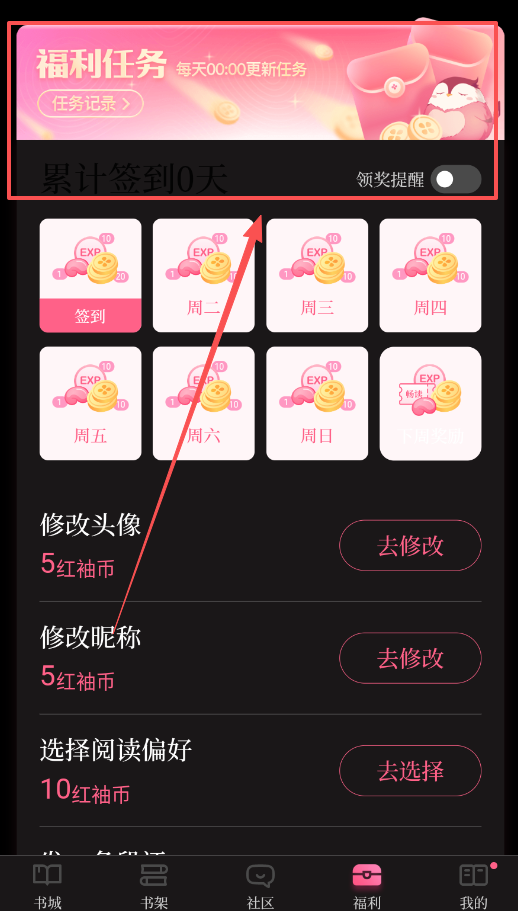 福利中心就像一个资源宝库,为你提供每日领币、先读后付等多种福利,只需简单操作,就能获取更多红袖币和畅读机会。