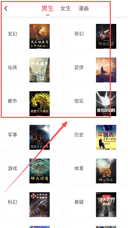 若想高效找书,可先进入“书城”,接着直接点击“男生”或“女生”频道,这两个频道内都细分了玄幻、都市、历史等十多种类型。