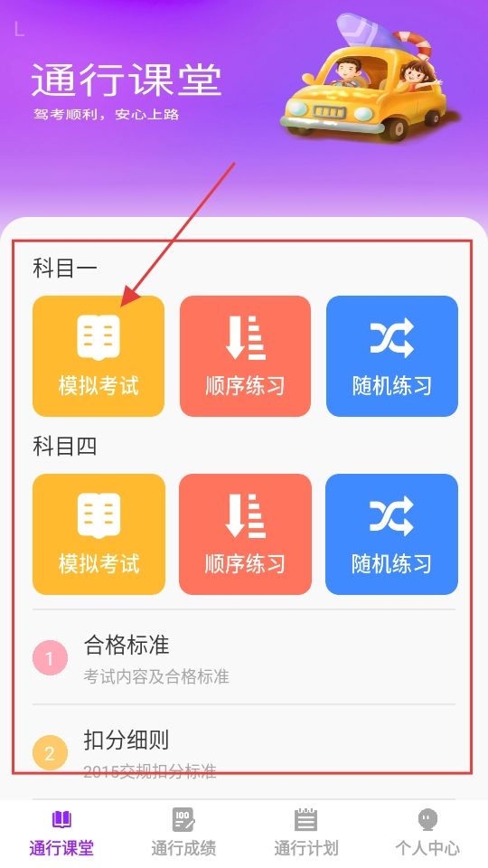 是一款聚焦驾考全流程辅助的工具类软件,整合科目一至科目四的完整题库资源,提供多元学习方案。用户可通过模拟考试了解掌握程度,借助顺序或随机练习强化知识,还能记录各科表现并定位不足。支持自主规划学习进度,搭配交通安全规范要点解析,界面简洁无干扰,题库随政策动态更新,助力用户系统备考,稳步提升成绩,顺利通过驾考各环节考核。打开应用后,能看到科目一和科目四的【模拟考试】【顺序练习】等功能选项,选择科目一的【模拟考试】,即可进入模拟考试的准备页面。
