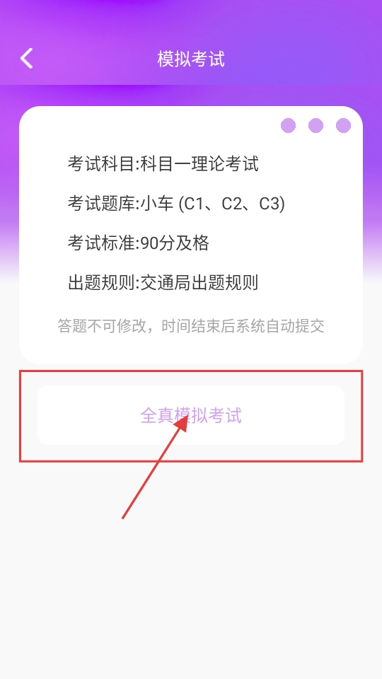 在模拟考试准备页面,可查看考试科目、题库等相关信息,点击【全真模拟考试】按钮,即可开始科目一的模拟考试。