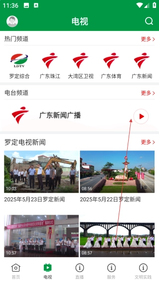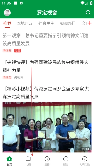 是集新闻传播、生活服务于一体的本地化综合平台,专为罗定居民打造便捷的数字生活入口。它深度融合本土媒体资源与实用便民功能,不仅实时推送罗定热点新闻、直播民生活动,还集成政务办理、交通出行、天气查询等服务,让用户通过一部手机,即可高效获取城市动态,享受“资讯+服务”的一站式便捷体验,全面提升生活效率与信息获取速度。打开罗定视窗,点击【电视】。