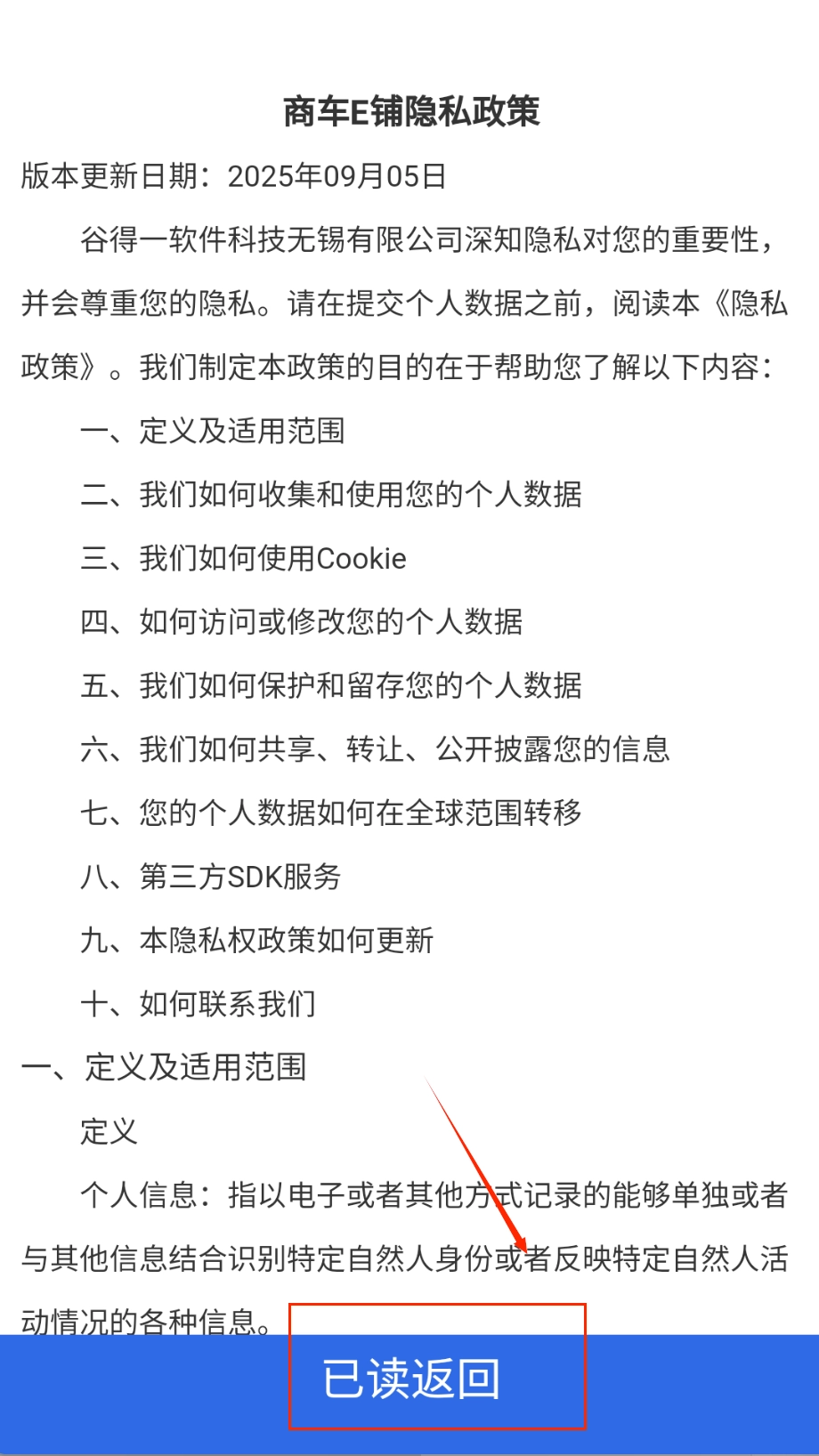 若想了解隐私政策的具体内容,可在登录界面点击带有下划线的“《隐私政策》”文字进入查看,阅读完毕后点击底部的“已读返回”即可回到登录页面。
