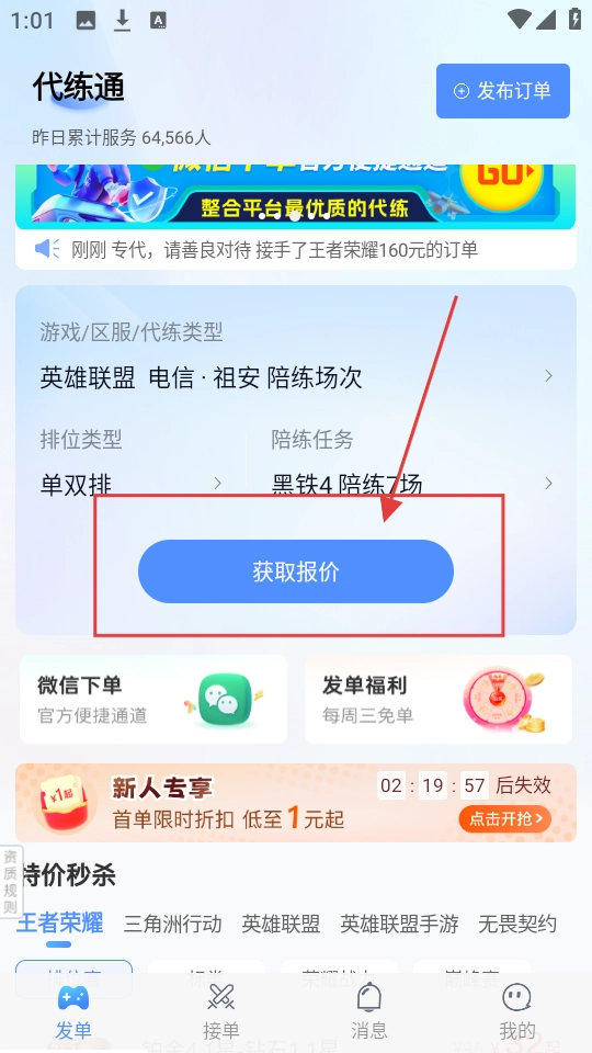 :确保安全和安心,代理学员可以在应用程序内实时查看和接受订单,可以实时响应客户需求。进入代练通主界面,点击下方的接单。