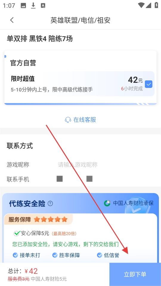 在报价页选定套餐后,点击【立即下单】按钮,就能完成代练订单啦,是不是超方便的呀~