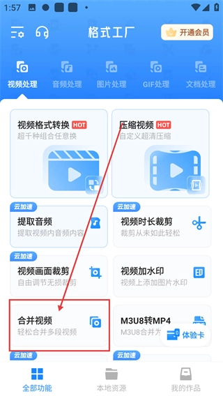 在格式工厂的全部功能页面,点击【合并视频】选项即可进入视频选择界面,之后就可以挑选需要合并的视频片段了。