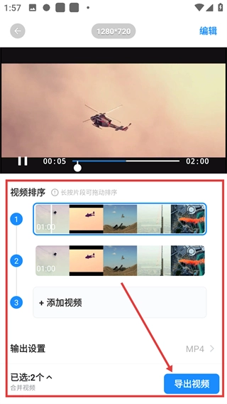 在合并设置页面,你可以调整视频的排序顺序,确认设置无误后点击【导出视频】按钮,此时会弹出导出方式的选择窗口,接下来就可以准备开始合并视频了。