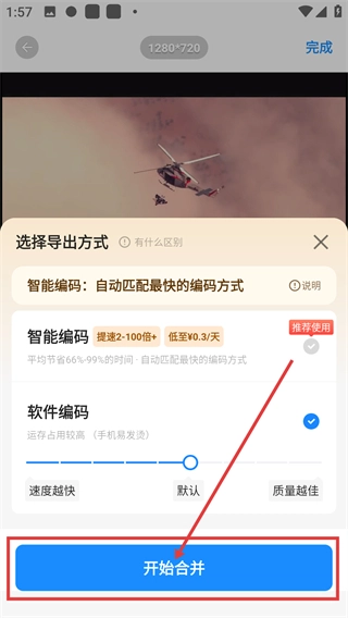 在导出方式窗口选定编码方式后,点击【开始合并】按钮即可启动视频合并流程,待流程完成后就能获取合并后的视频文件了。