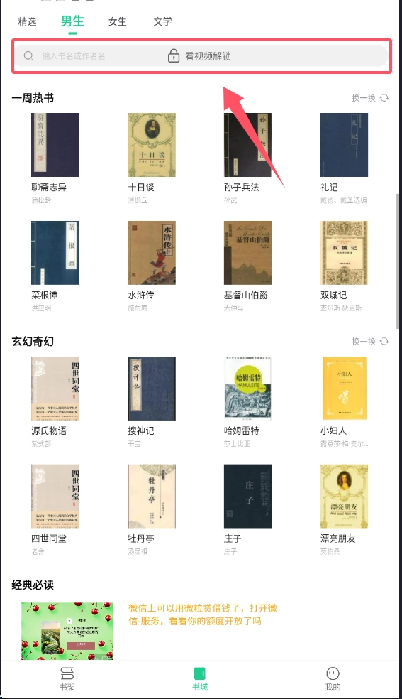 打开软件后,首先映入眼帘的是底部导航栏,点击位于中间位置的书城按钮,即可进入找书页面。在页面上方,设有精选、男生、女生、文学等分类标签。