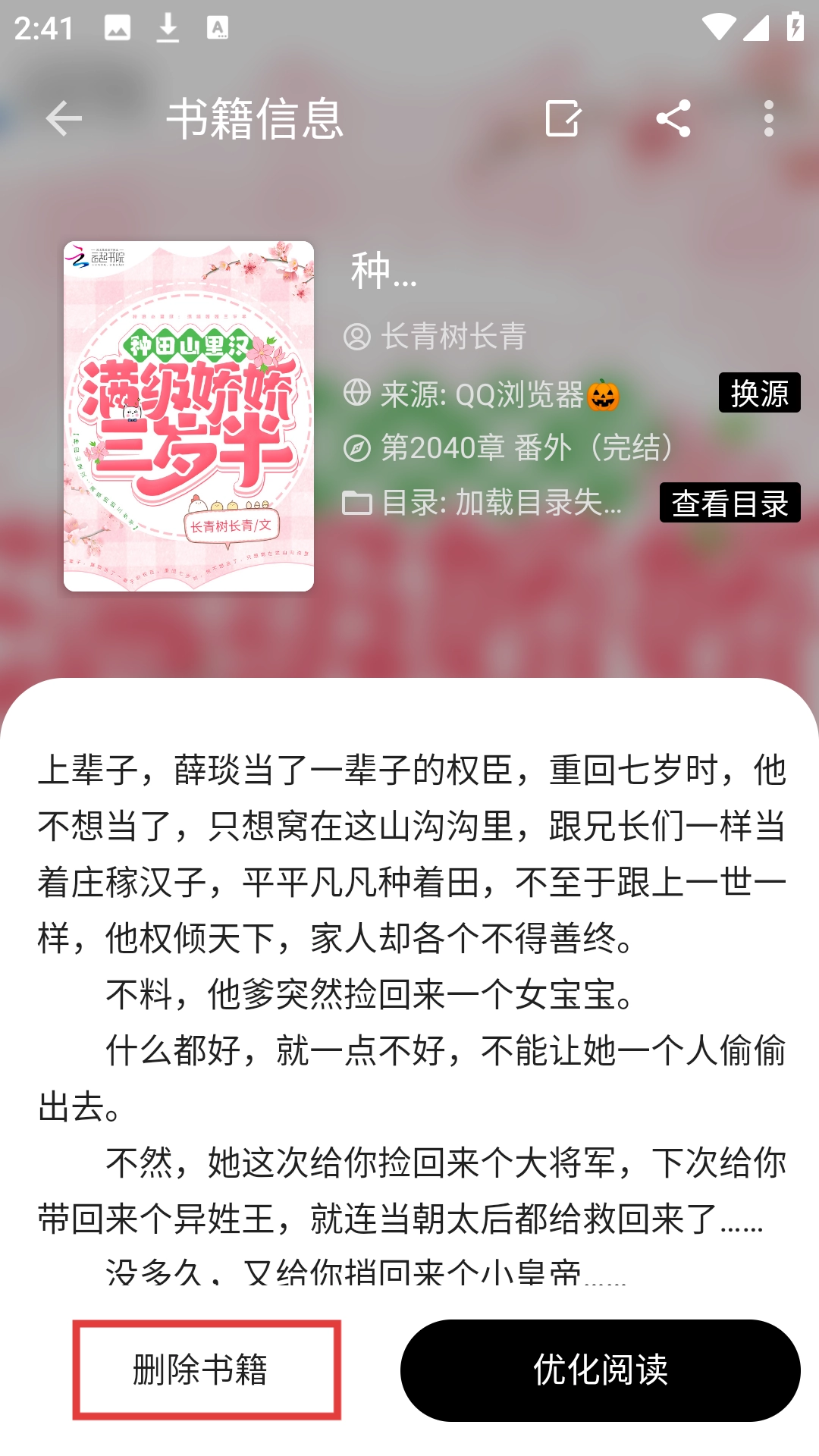 要是不想继续看了,点击【删除书籍】就能把这本小说从书架上移除啦。