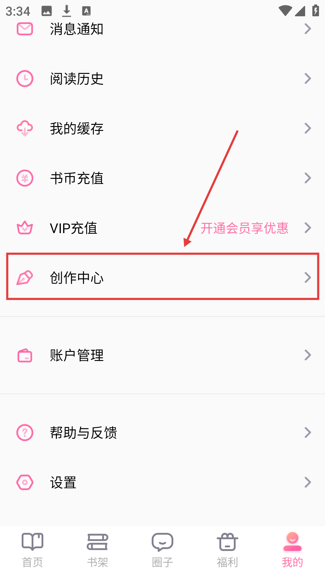 在个人中心页面,点击【创作中心】选项,即可进入与创作相关的页面。
