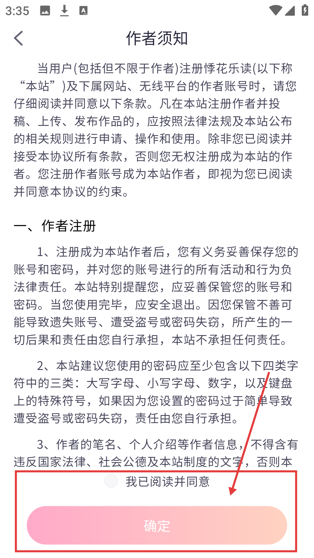 在作者须知页面,勾选“我已阅读并同意”后点击“确定”按钮,就能继续进行注册流程啦。