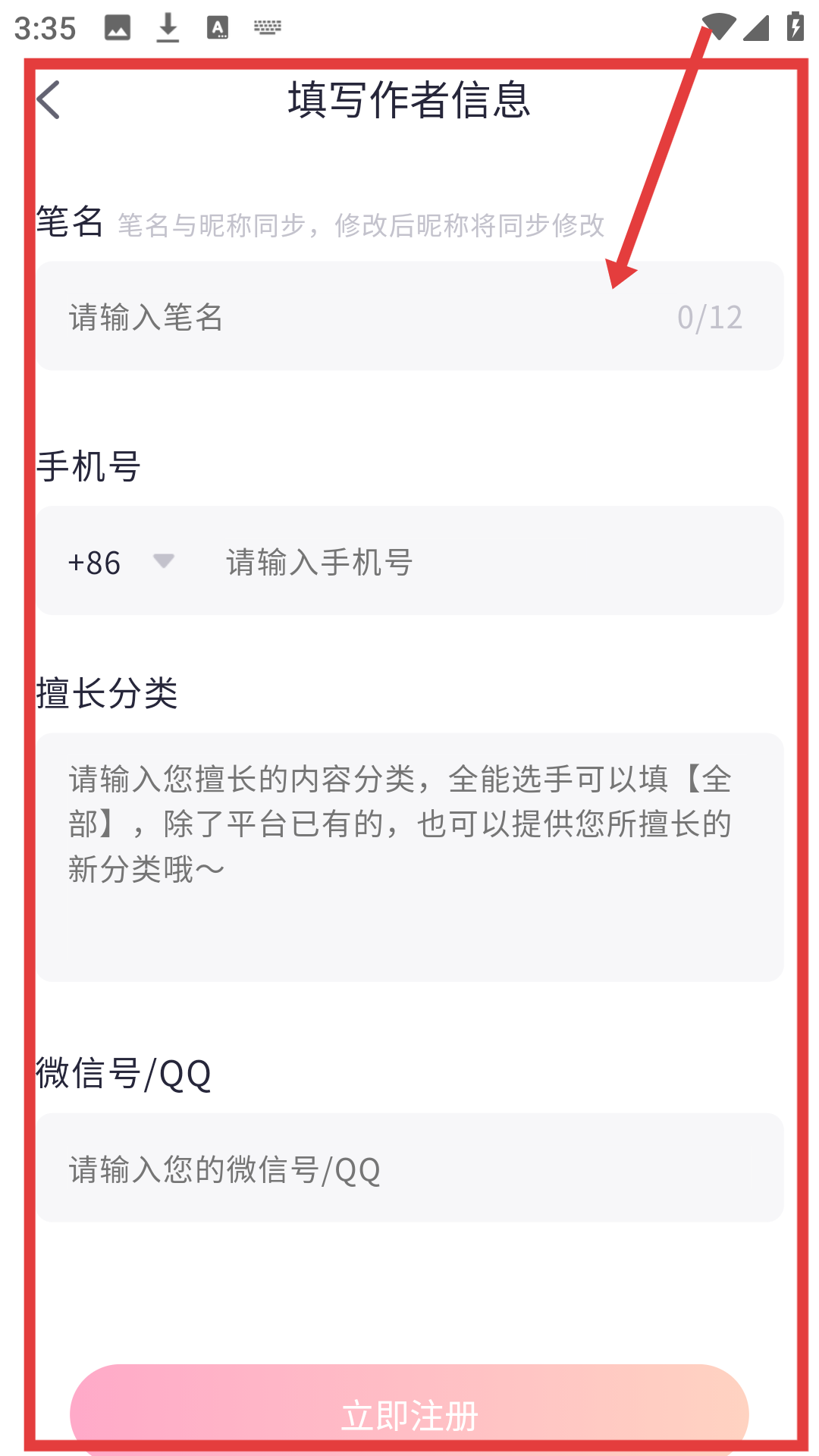 在填写作者信息页面时,输入笔名、手机号等信息后点击【立即注册】按钮,就能完成作者注册啦。