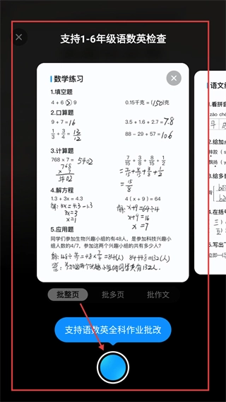在作业批改页面,上传1至6年级语文、数学、英语的作业后,点击对应的按钮,就能完成全科作业的批改啦。