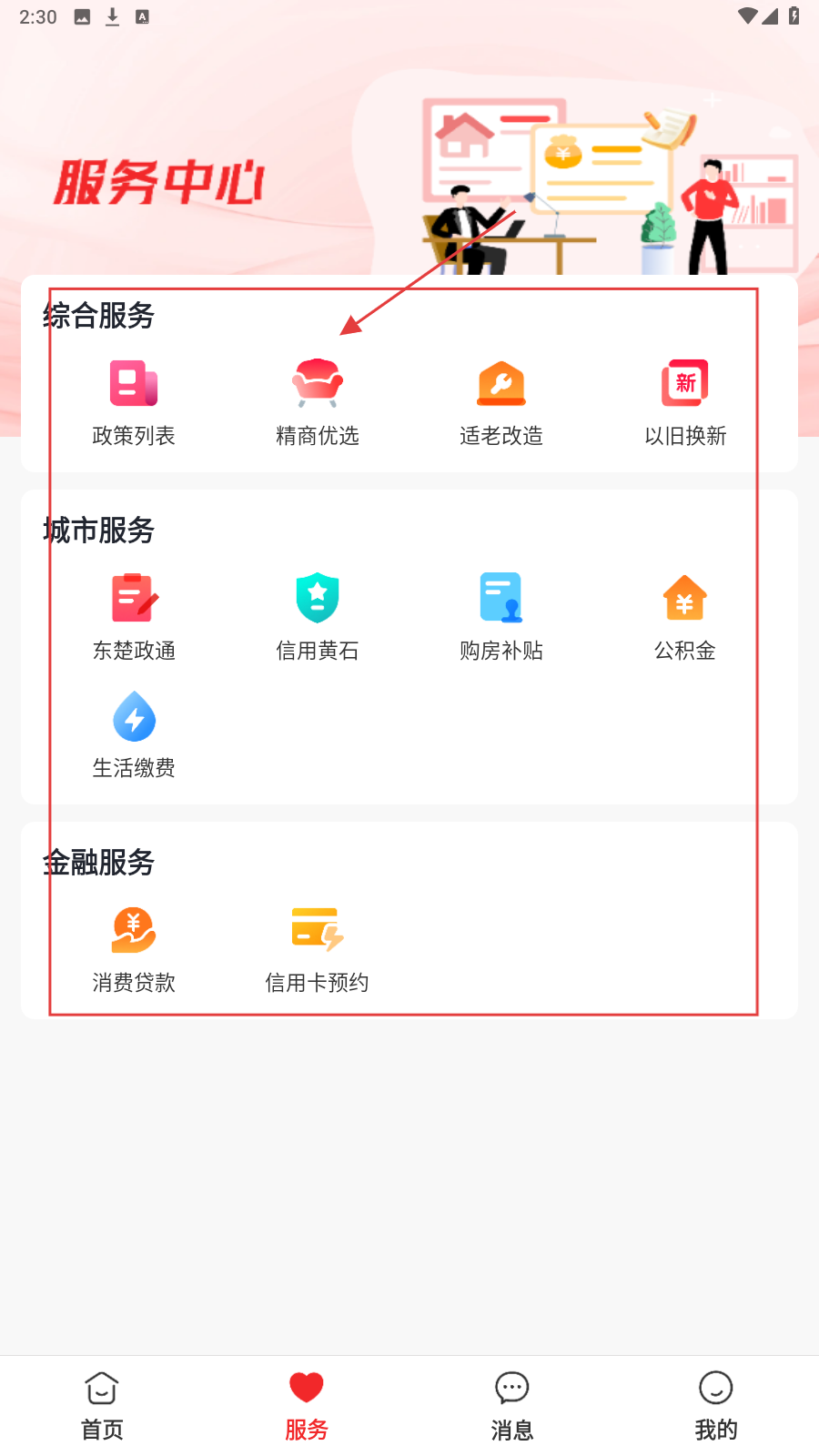 使用服务功能时,进入【服务】页面,选择【精商优选】等选项,即可获取房产相关的综合服务。