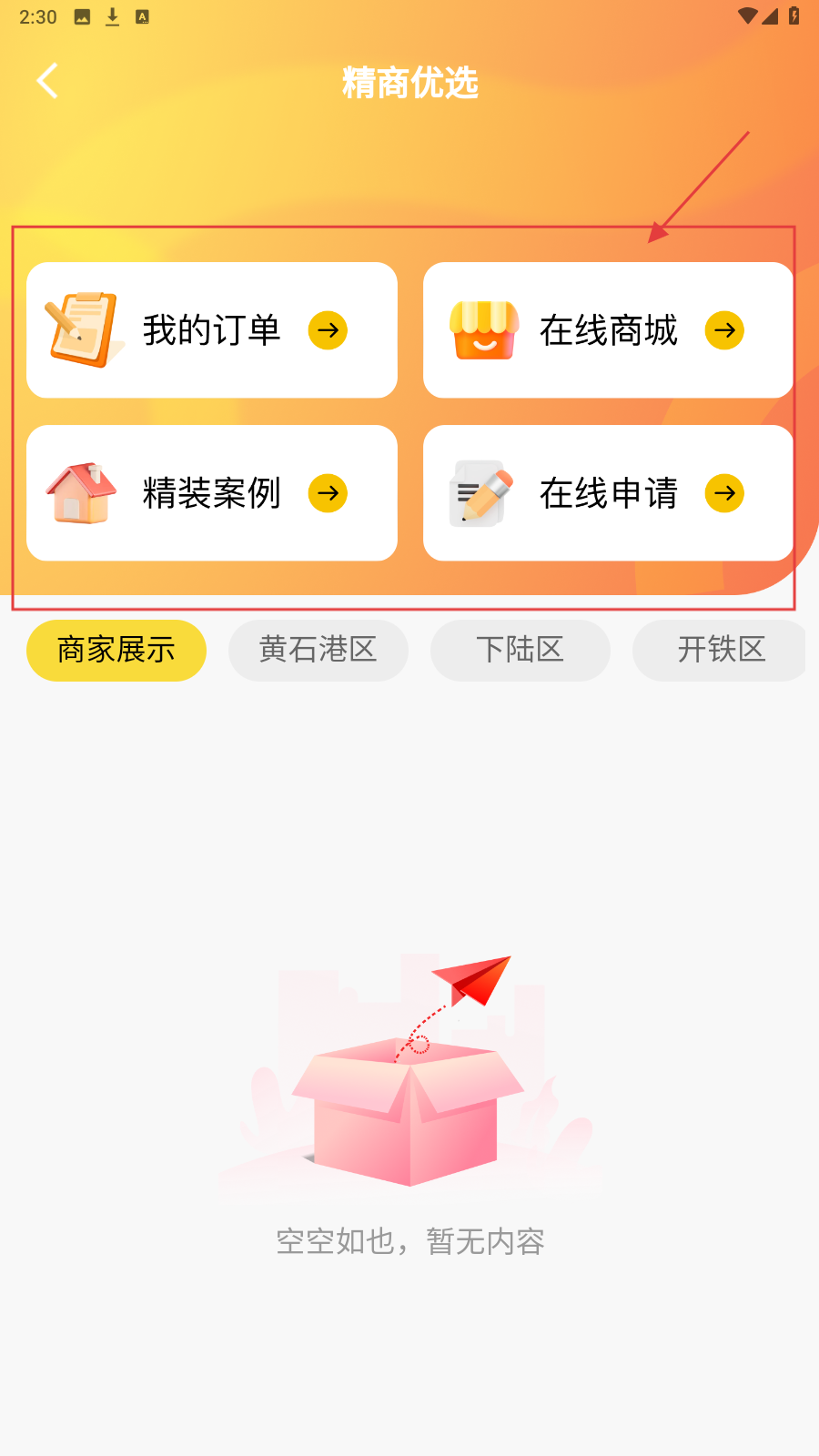进入精商优选页面后,点击【我的订单】可管理订单,点击【在线商城】能逛房产商城。