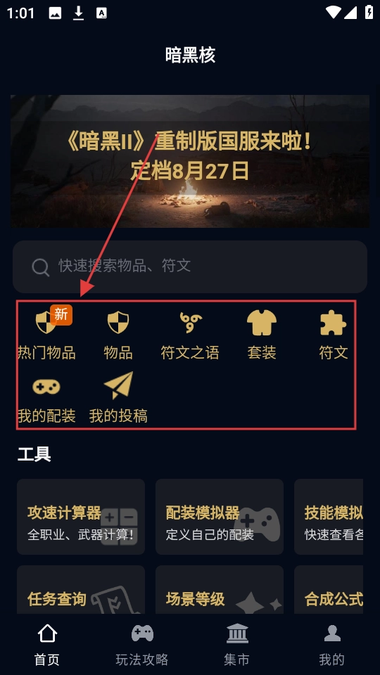 在暗黑核首页,设有【热门物品】【符文之语】等功能入口,点击即可查看对应内容,非常实用。
