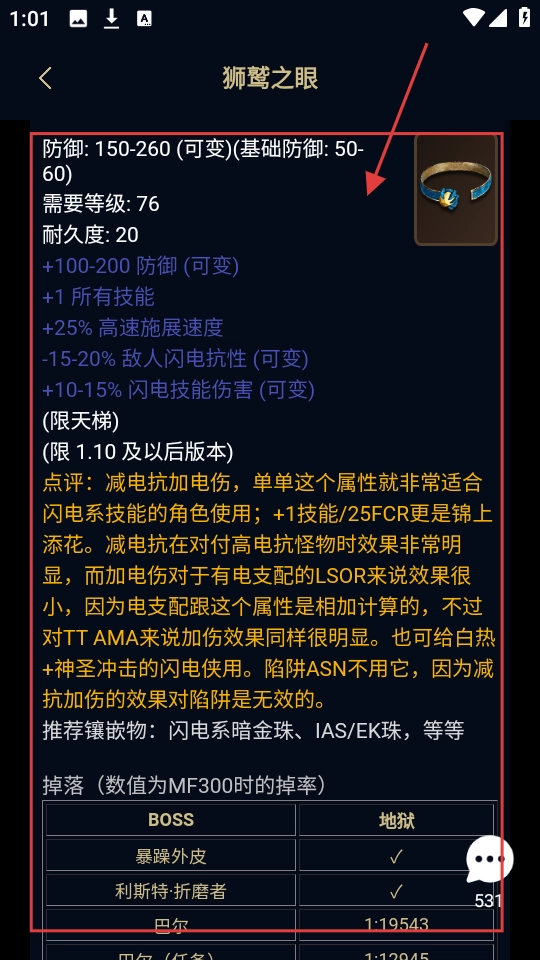 点击【狮鹫之眼】,就能查看它的防御、技能等属性与点评,同时了解掉落信息,助力你更合理地搭配装备。