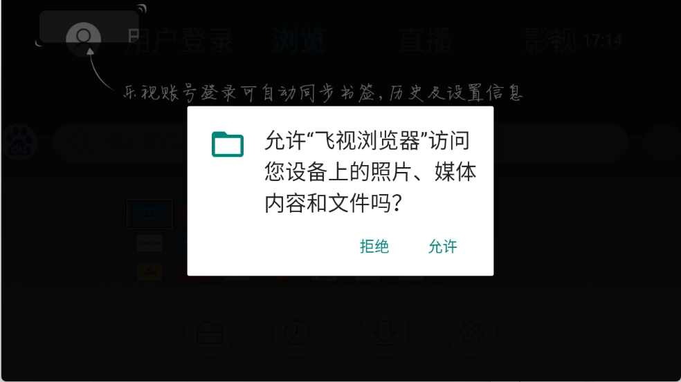 1、在12365飞视浏览器,允许相关的权限。