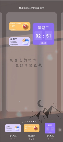 灵动鸟小组件包含高仿苹果手机桌面的壁纸、小组件、状态栏等内容,一键快速替换且支持自由编辑,让安卓手机也能体验苹果桌面的功能!
