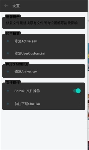 3、在设置界面可以修复和平精英、PUBG MOBILE的文件错误,或者与shizuku链接使用