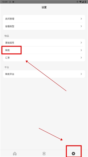 进入软件后点击下方齿轮状设置按钮,点击种类选项。