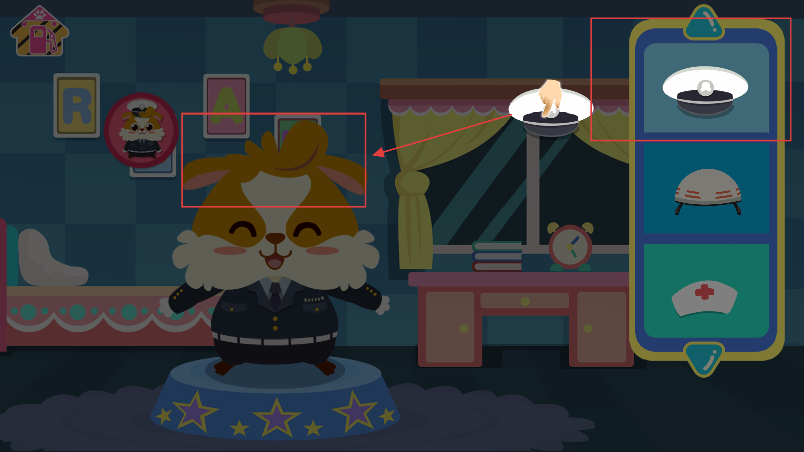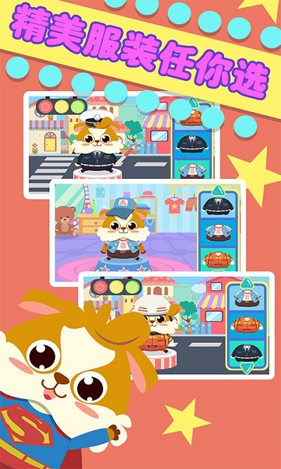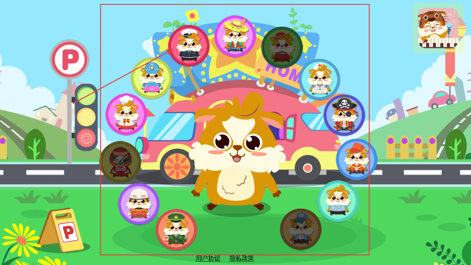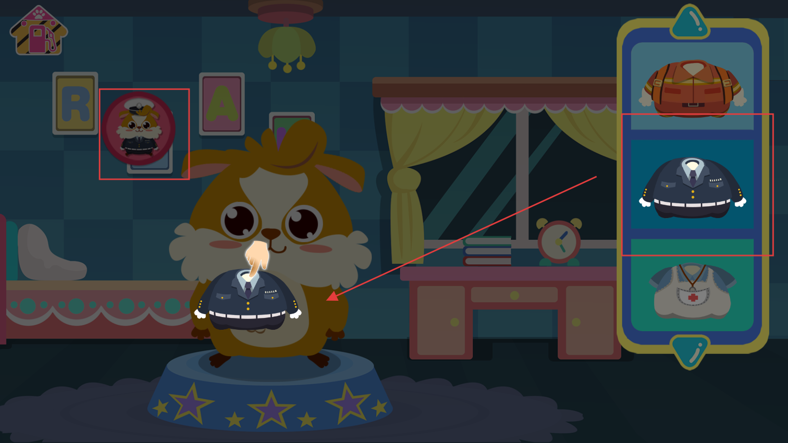 打开游戏后,在初始界面里,点击中间小动物周边的职业头像,挑选你想装扮的职业,比如点击穿制服的那个头像。