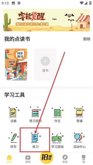 在首页的学习工具区域点击【练习】选项,即可进入练习功能的年级选择界面。