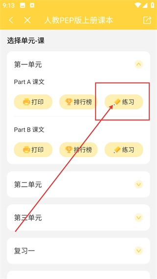 进入单元-课页面后,找到对应课文旁边的【练习】按钮并点击,即可开启该内容的练习任务。
