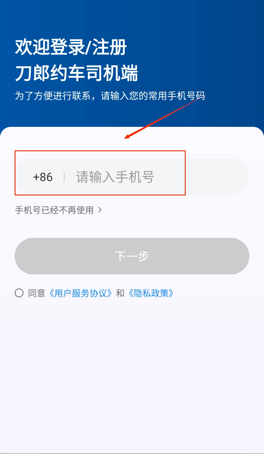 登录时输入常用手机号即可,若号码已停用,可点击提示进行更换,另外需要勾选同意协议选项,才能点击下一步按钮。