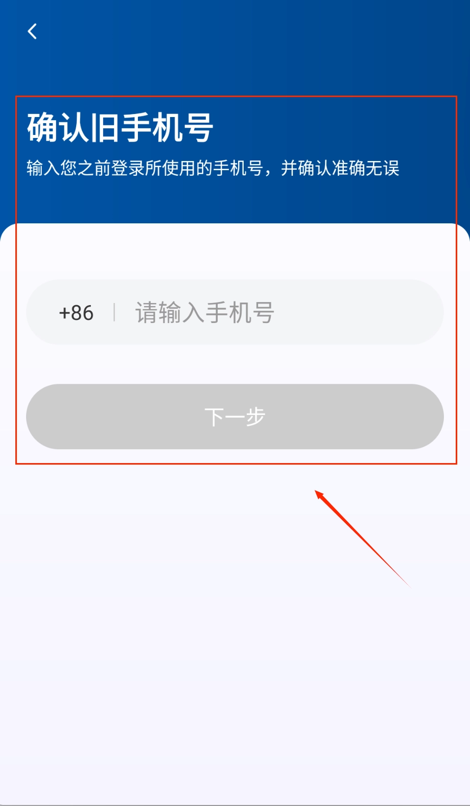 更换手机号的操作步骤如下:首先需确认旧号码,然后在蓝色背景的页面中输入原来用于登录的手机号,核对信息无误后,点击灰色的“下一步”按钮即可继续后续流程。