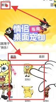 打开应用后,在首页点击【首页】按钮就能浏览各类桌面宠物,也可以通过【最热】分类来挑选心仪的桌面宠物形象。