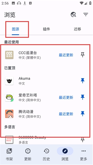 进入浏览页面的【图源】栏后,会出现多个资源平台选项,像【腾讯动漫】就在其中,你可以根据自己的需求进行选择。