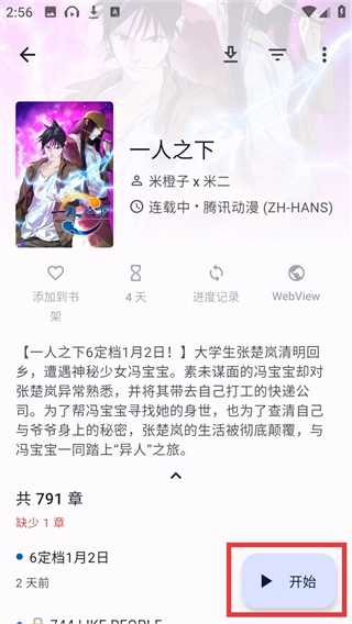 在《一人之下》的详情页面点击右下角的【开始】按钮,就可以开启这部作品的阅读了。
