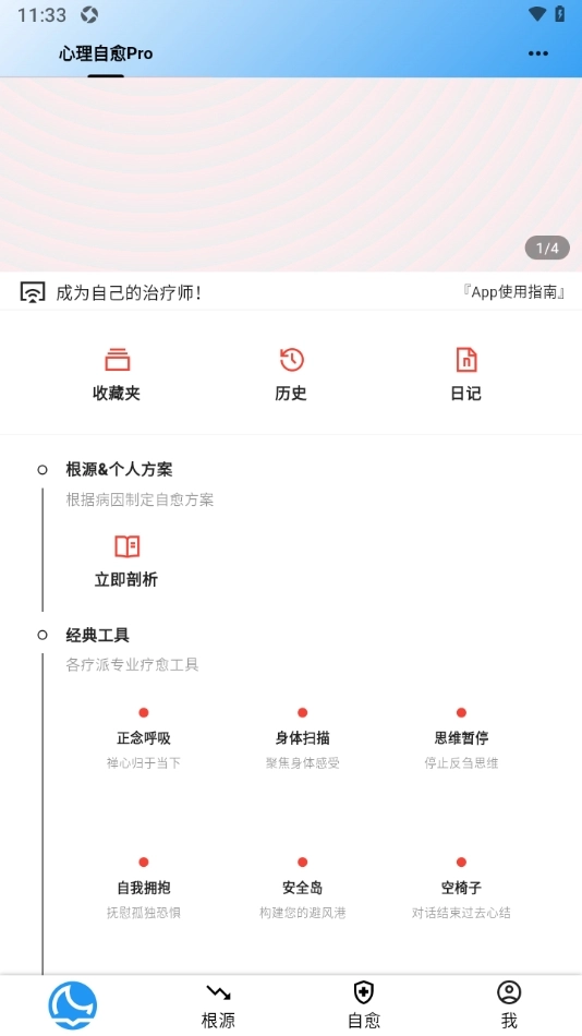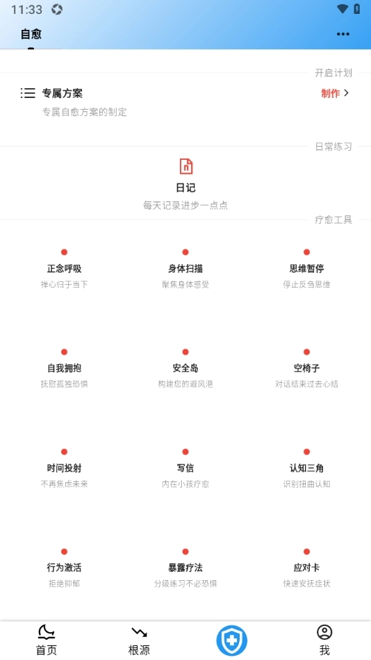 这里不仅提供自愈相关的专属方案制定服务,下方还配备了一些实用的自愈工具。除此之外,用户还能随时查看历史测评报告,收藏自己感兴趣的课程与文章。我们从每一个细节入手,致力于为用户打造一个舒适且安心的使用环境。
