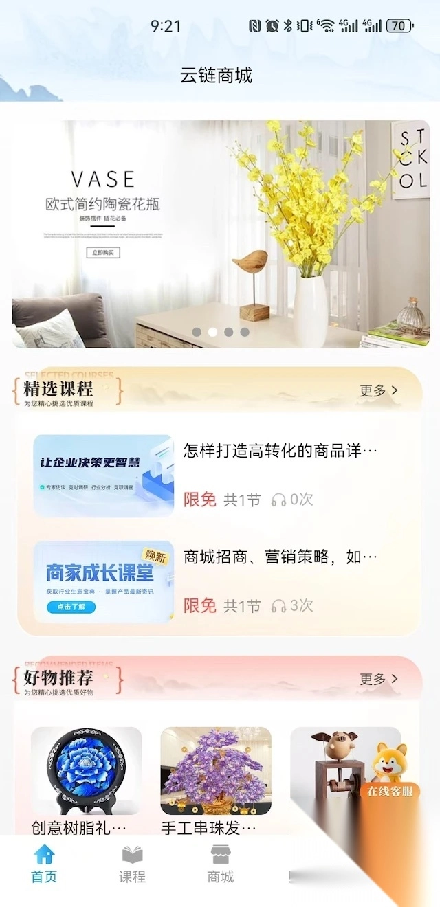 首页设有精选课程和好物推荐两大版块,商家能随时高效学习各类课程。