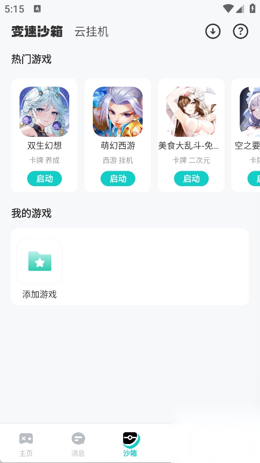 沙箱页面里有不少热门游戏,并且能够开展云挂机操作。