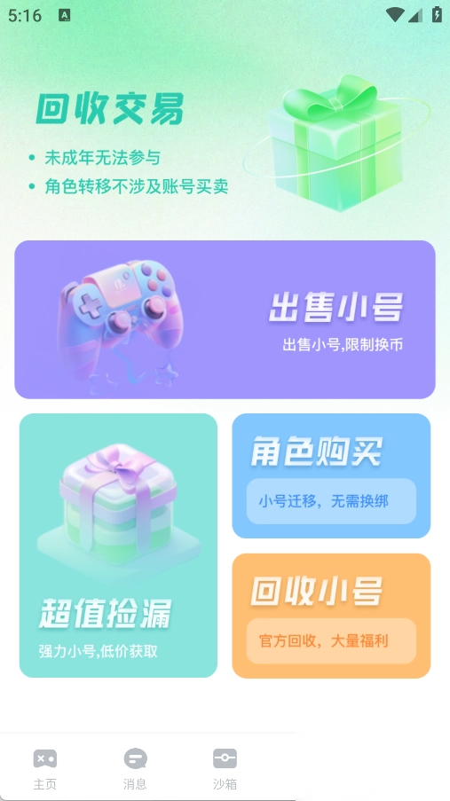 在交易页面,你能够开展出售小号、超值捡漏、角色购买以及回收小号之类的操作。