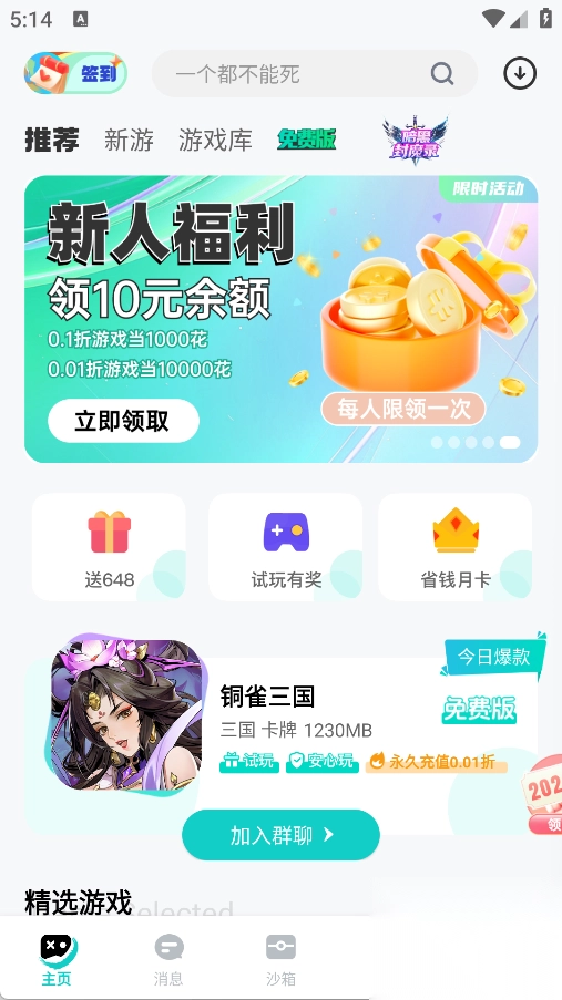 首页设有送648、试玩有奖、省钱月卡等版块,还能在里面了解各类精选游戏。