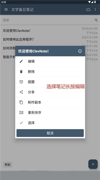 3.回到首页,选择笔记长按即可编辑