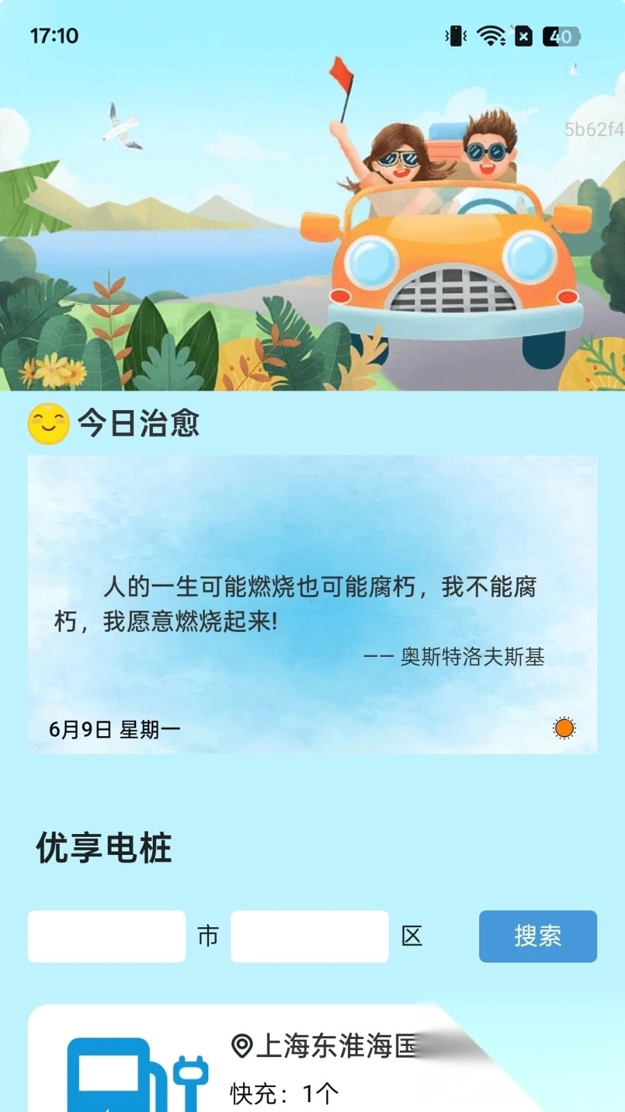 每日为您更新治愈语录,助您规划行程;同时提供实时定位功能,可匹配附近充电桩,让您快速找到周边的充电站点。