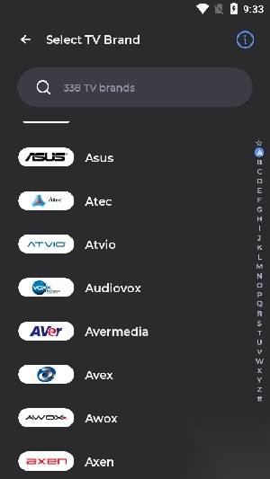 各类电视遥控器里的“电视遥控器TV Remote Control”软件,能够支持一千多种电视型号,单从适配电视的数量来看,它算是当前市面上遥控器软件里的佼佼者。这款软件覆盖了一百多个国家和地区的红外遥控功能,用户只要选择好电视品牌,就能完成匹配,操作简单还没有广告打扰。