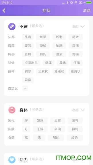 覆盖经期全流程数据采集:起止时间、出血量等级、伴随症状(腹痛、头痛、情绪波动等)、基础体温曲线、同房记录、宫颈黏液变化等。所有条目结构化归档,支持按月/季/年维度筛选查看,既便于自我观察身体规律,也能一键导出完整健康档案,为就医问诊提供专业、可信的数据支撑。