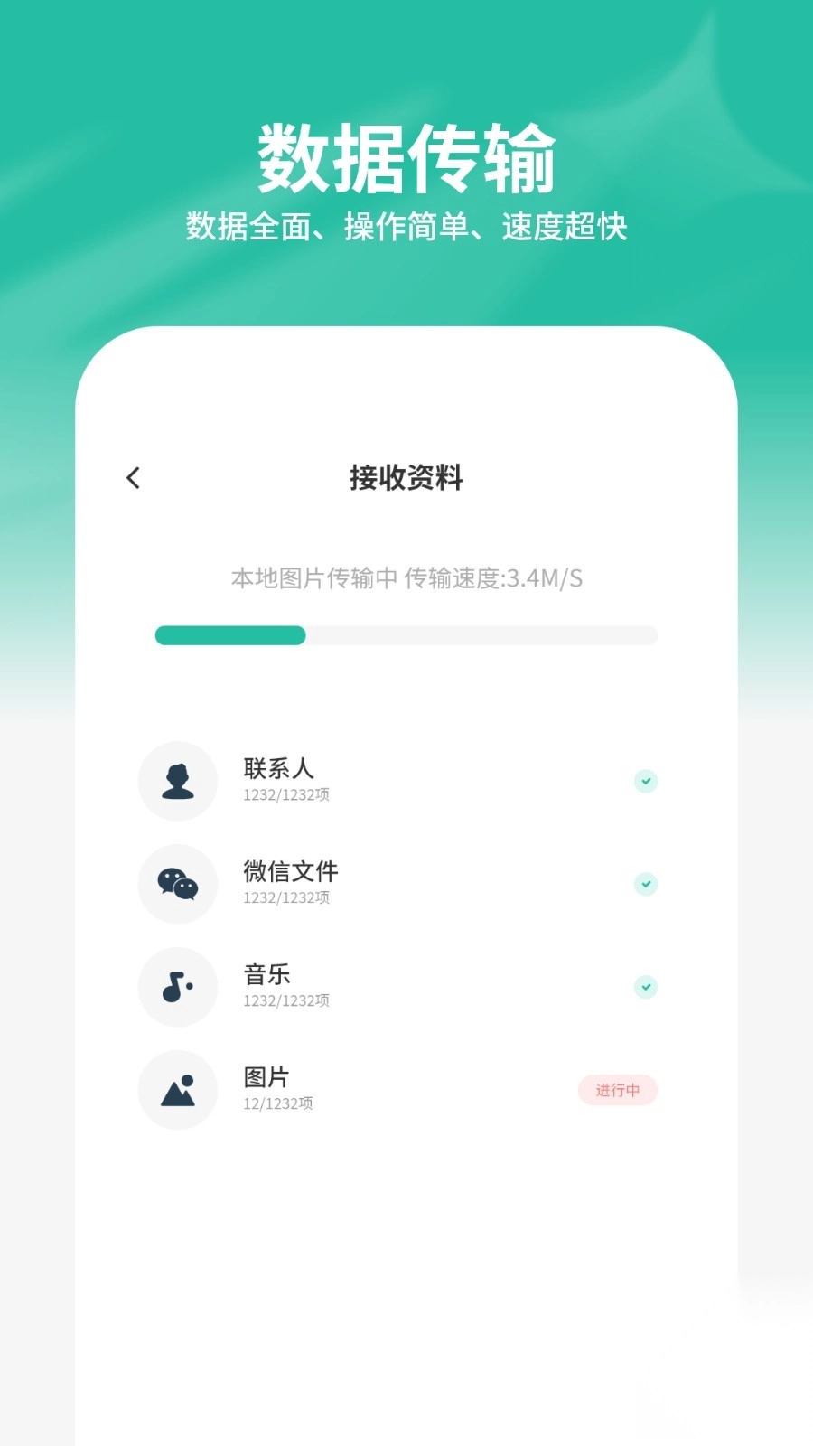 支持所有常用数据类型的迁移工作,开展数据迁移时,不必对每个文件、每个应用分别执行备份和转移操作,系统会自动识别并将相关数据打包处理。