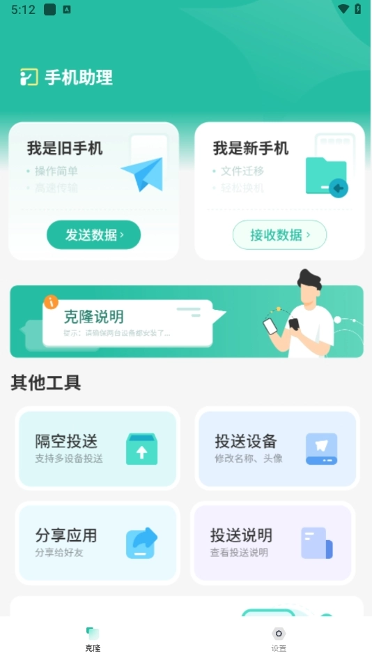 首页呈现了新机选择、旧机连接、数据类型勾选、开始迁移等各项核心功能,用户只需依据提示,通过简单几步操作,即可完成新旧手机的连接以及数据迁移的准备工作。
