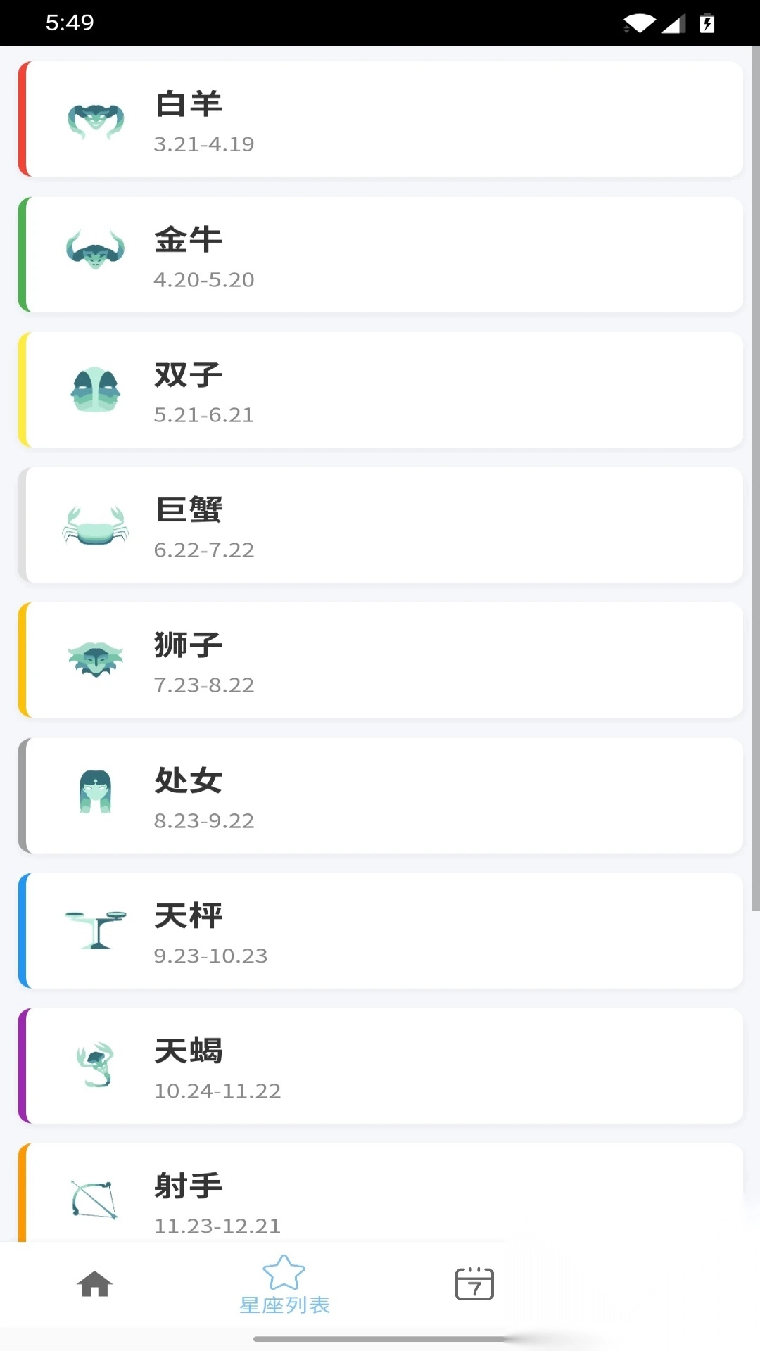 在星座列表中汇集了十二星座,可以根据自己的星座查看详情;