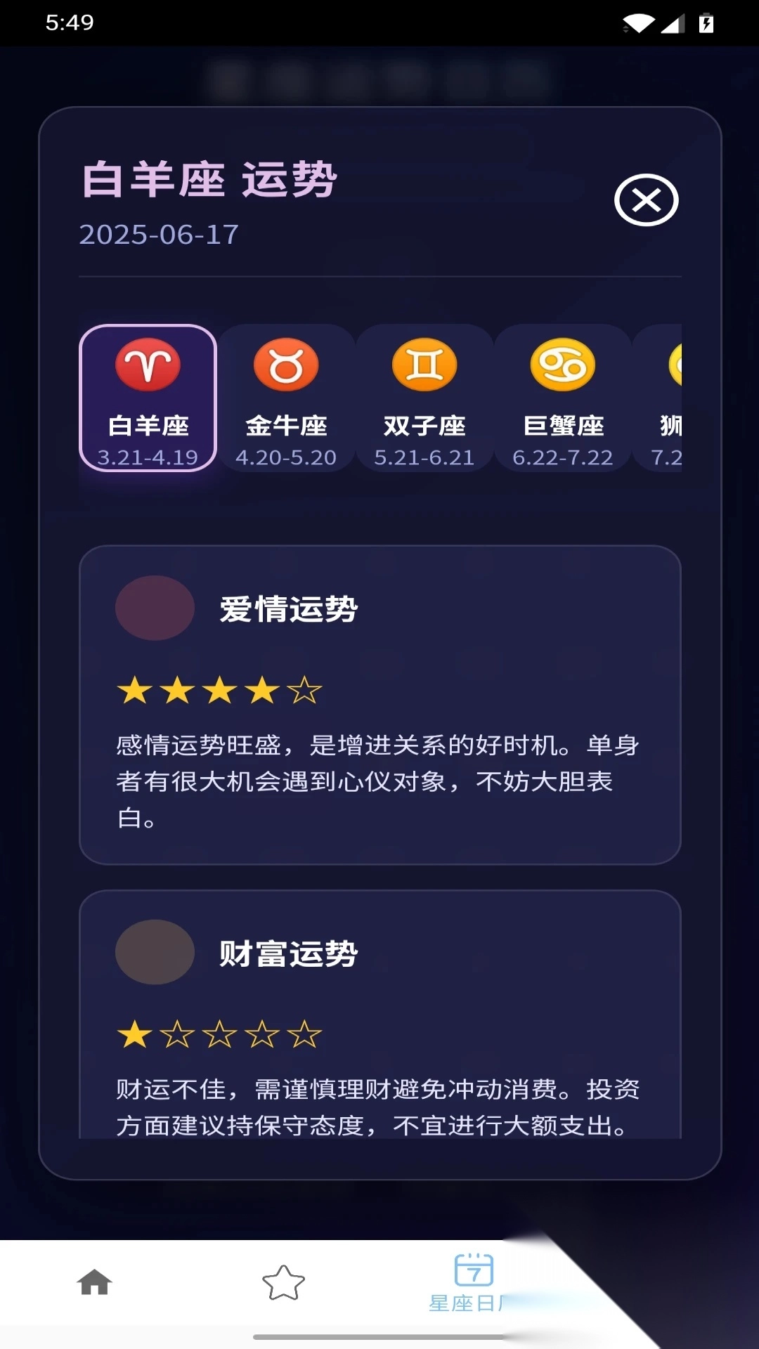 界面设计简洁直观,用户能够迅速找到并深入了解自己或他人的星座信息。